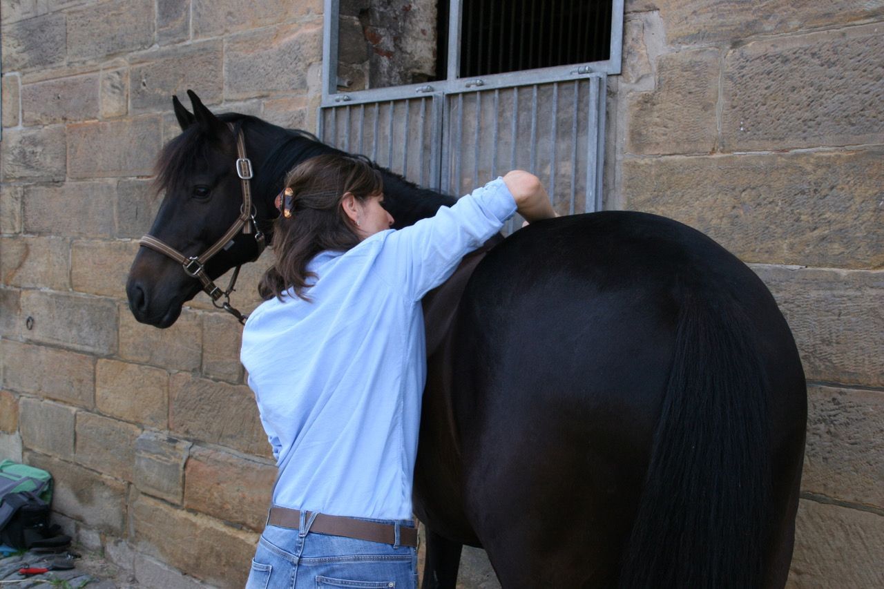 Zum Lösen von Spannungen und Schmerz in Muskulatur, Bindegeweben und Gelenken arbeite ich mit Techniken der klassischen Sportmassage, Triggerpunktkompression, Faszienarbeit, Craniosacraler Osteopathie, Akupressur, Gelenkmobilisation und Lymphdrainage, um Ihr Pferd bestmöglich zu unterstützen.